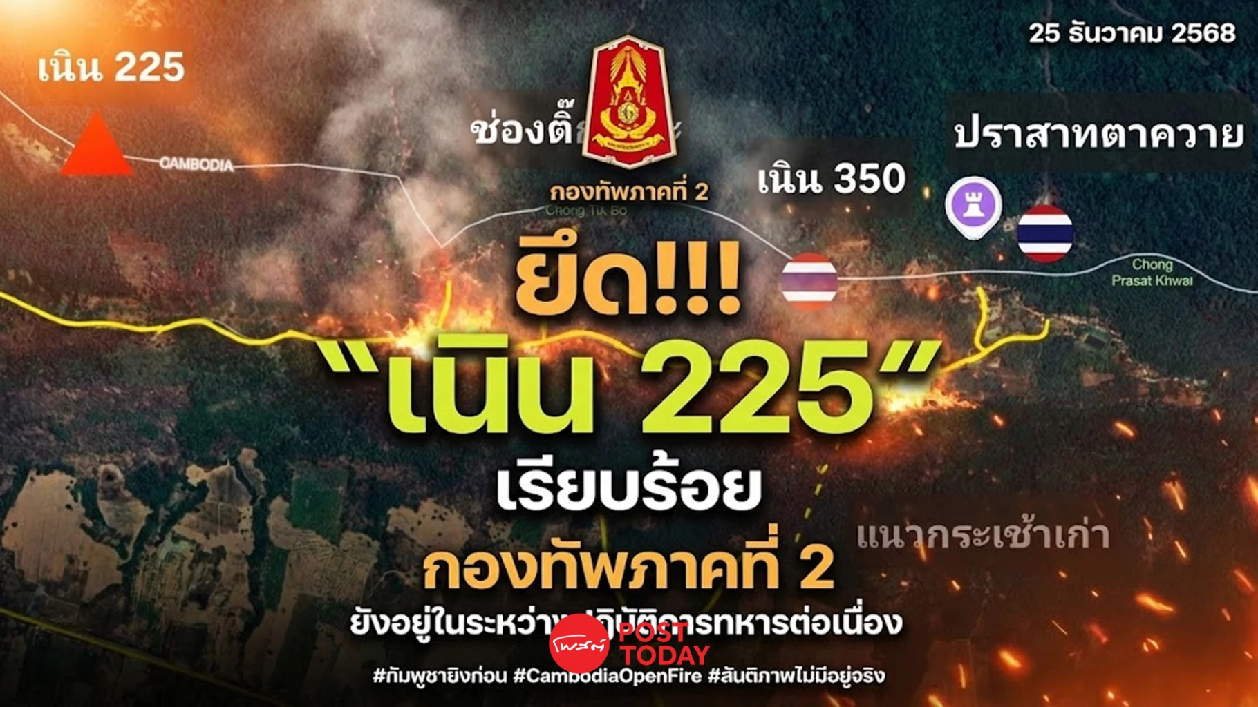 เมื่อวันที่ 25 ธันวาคม 2568 สถานการณ์ชายแดนไทย-กัมพูชา เข้าสู่วันที่ 18 ล่าสุด กองทัพภาคที่ 2 โพสต์ยืนยันสามารถยึด “เนิน 225” ได้เรียบร้อย และยังอยู่ระหว่างปฏิบัติการทางทหารอย่างต่อเนื่อง