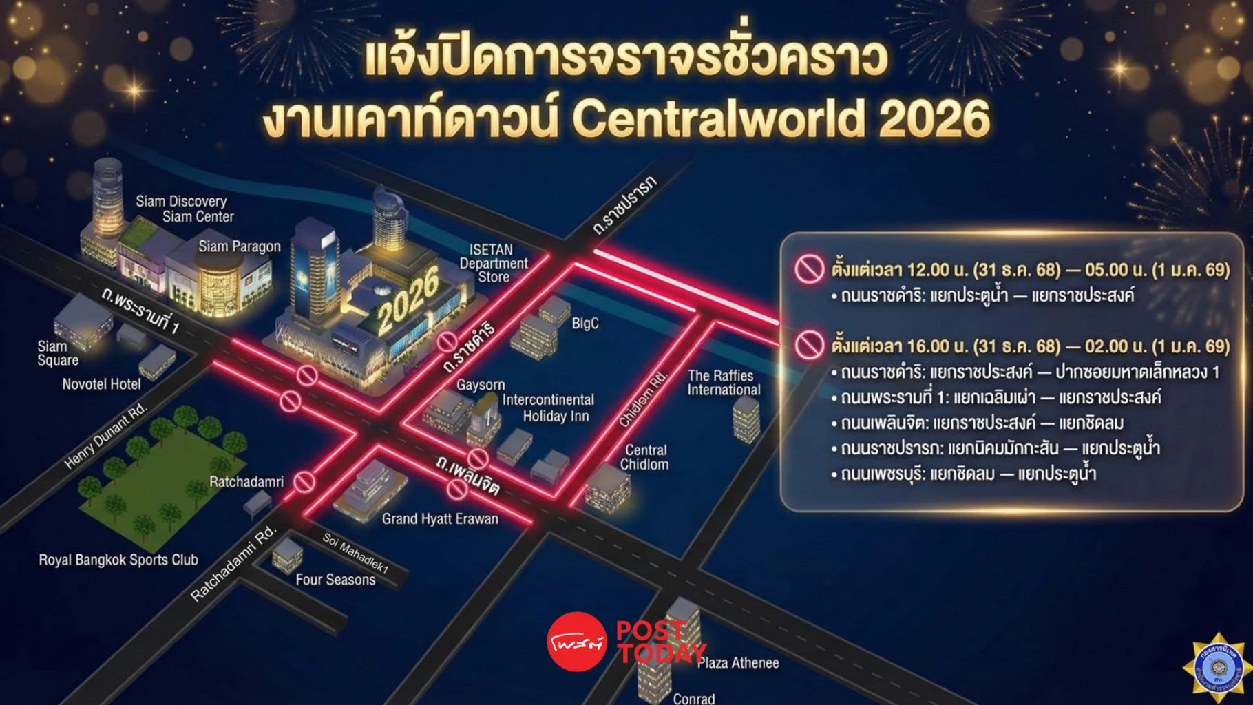 - ตำรวจนครบาลประกาศปิดถนน 6 เส้นทางบริเวณแยกราชประสงค์ เพื่อจัดงานเคานท์ดาวน์ Central World 2026