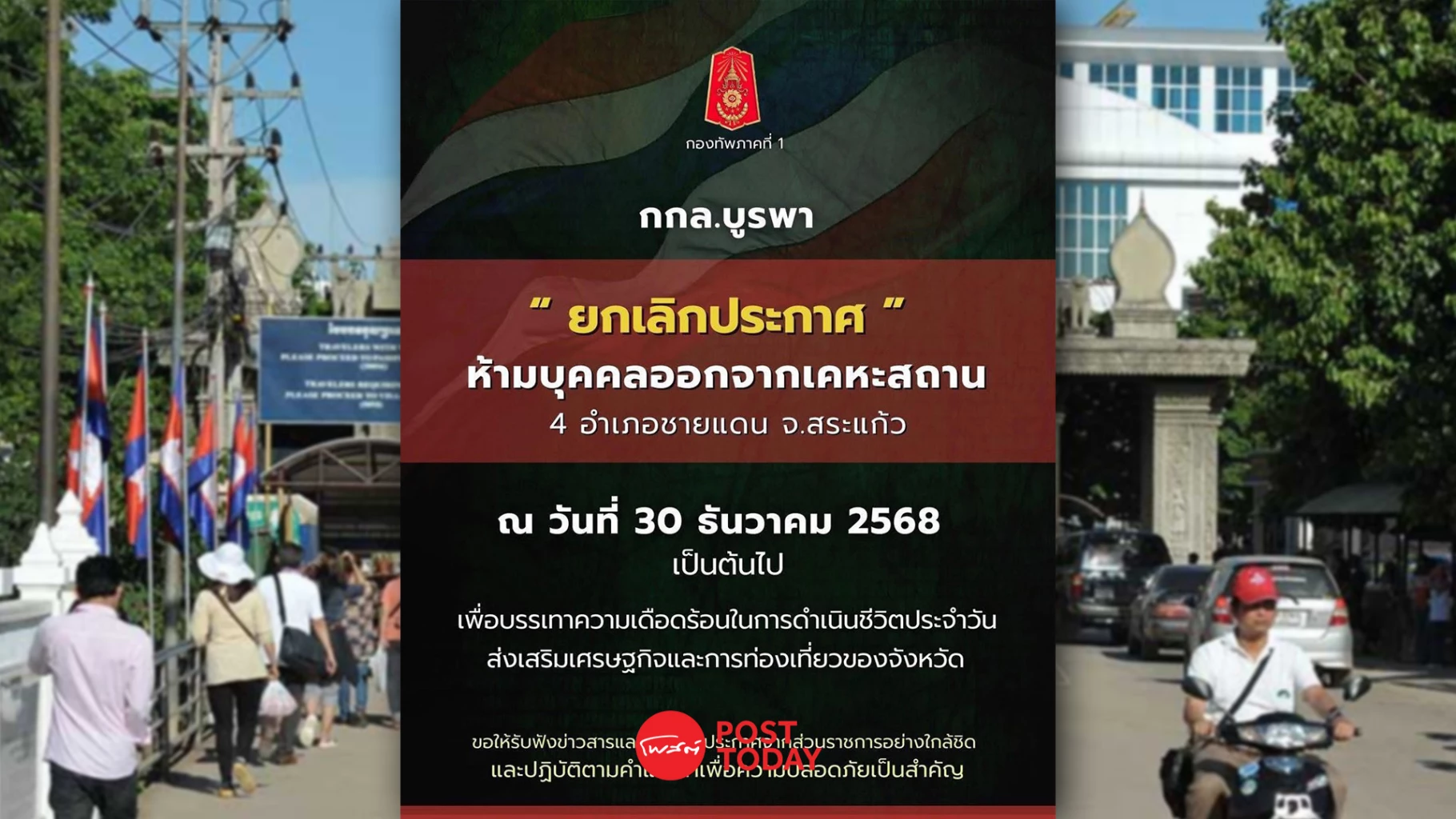 ตามที่ กองกำลังบูรพาได้ออกประกาศห้ามบุคคลออกนอกเคหสถานตั้งแต่เวลา 19.00 - 05.00 น. ในพื้นที่ 4 อำเภอ ตามแนวชายแดน จังหวัดสระแก้ว ได้แก่ อำเภอตาพระยา อำเภอโคกสูง อำเภออรัญประเทศ และอำเภอคลองหาด ลงวันที่ 10 ธันวาคม 2568 นั้น