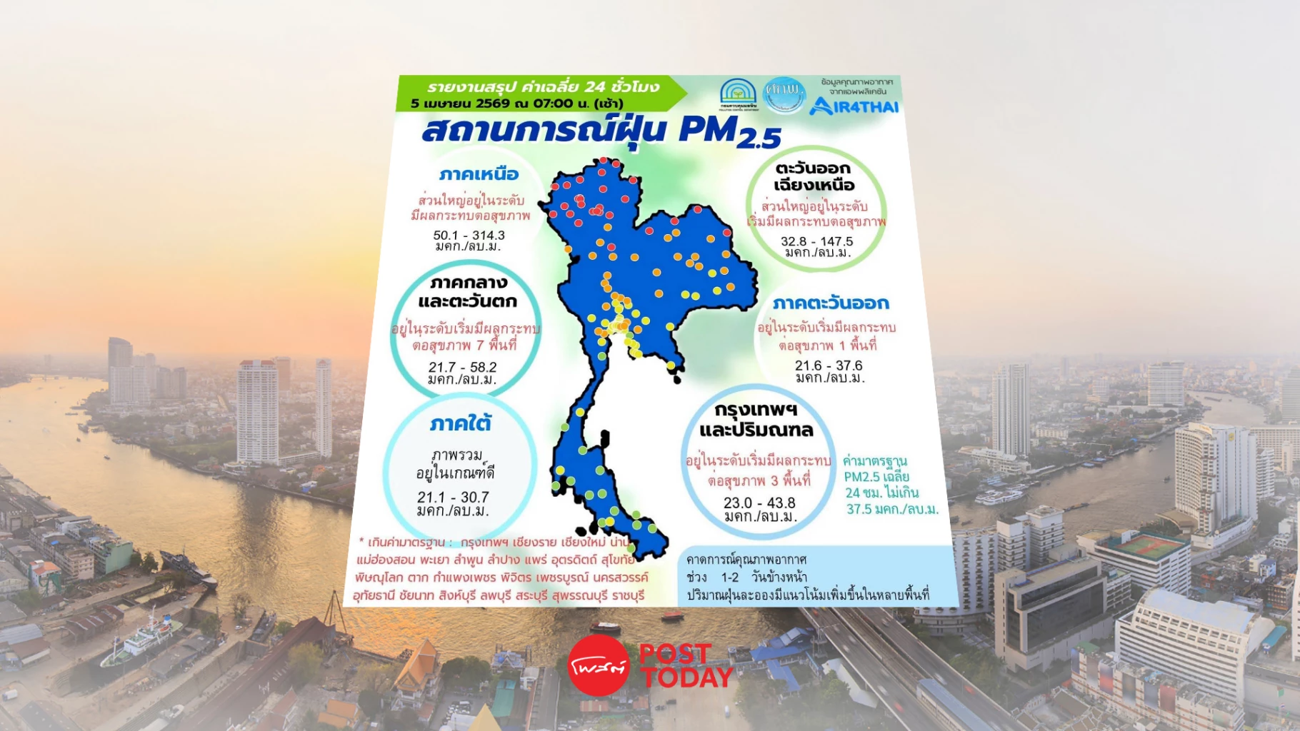 ศกพ. รายงานสถานการณ์ฝุ่น PM2.5 เช้าวันที่ 5 เมษายน พบพื้นที่กรุงเทพฯ และอีก 41 จังหวัดมีค่าฝุ่นเกินมาตรฐาน โดยเฉพาะภาคเหนือ - อีสานที่วิกฤตหนัก