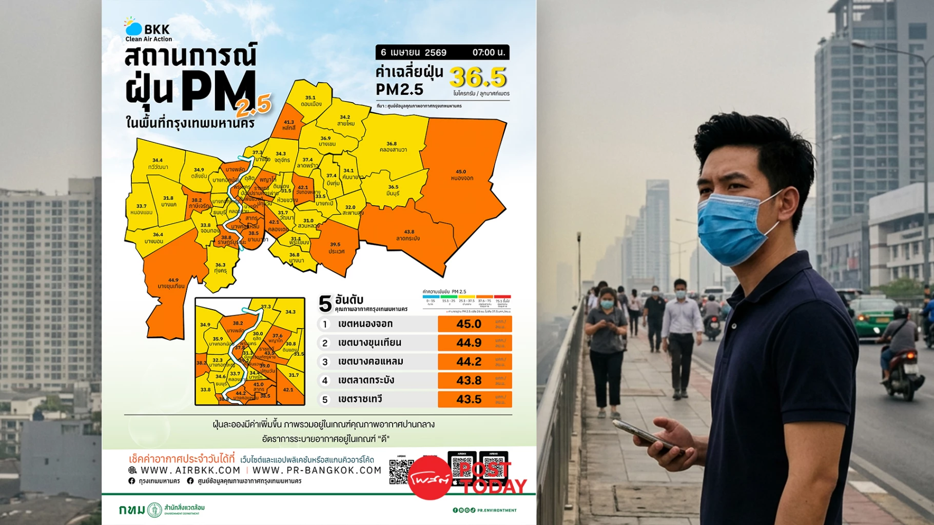 ศูนย์ข้อมูลคุณภาพอากาศกรุงเทพมหานครรายงานค่าฝุ่น PM 2.5 วันที่ 6 เมษายน 2569 พุ่งระดับสีส้ม 16 พื้นที่ กระทบสุขภาพ ประชาชนควรสวมหน้ากากและเลี่ยงที่โล่งแจ้ง