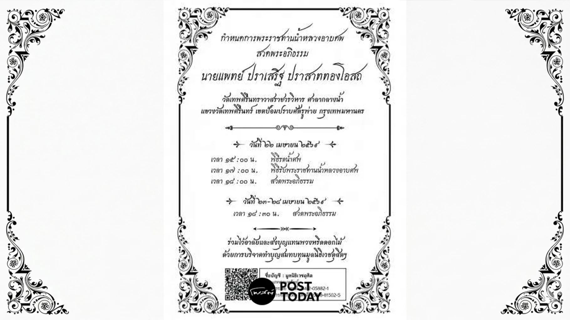 วงการธุรกิจไทยเศร้า นพ.ปราเสริฐ ปราสาททองโอสถ เสียชีวิตอย่างสงบในวัย 93 ปี ครอบครัวเตรียมจัดพิธีรดน้ำศพและสวดพระอภิธรรม ณ วัดเทพศิรินทร์ 22 เม.ย. นี้