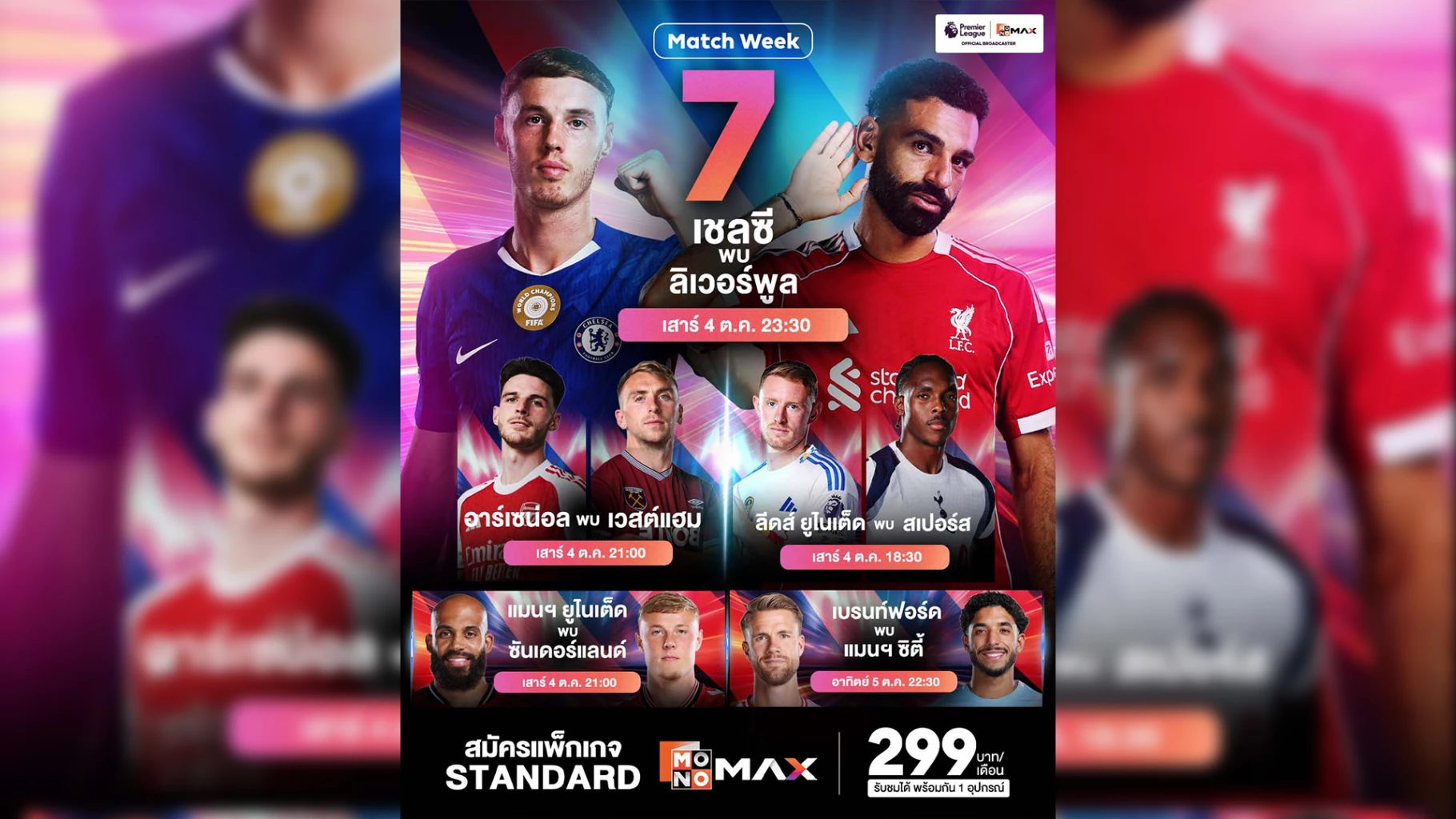 เปิดม่านกันตั้งแต่เช้ามืด วันเสาร์ที่ 4 ตุลาคม 2568 เวลา 02:00 น. (คืนวันศุกร์ที่ 3 ตุลาคม 2568) รับชมทาง Monomax กับ บอร์นมัธ เปิดบ้านรับมือ ฟูแล่ม ทั้งสองทีมต่างต้องการแต้มเพื่อขยับอันดับ ต่อเนื่องช่วงหัวค่ำ เวลา 18:30 น. ความมันส์ต่อเนื่องที่สนามเอลแลนด์ โร้ด ลีดส์ ยูไนเต็ด เปิดรังต้อนรับการมาเยือนของ ท็อตแน่ม ฮ็อตสเปอร์ ศึกนี้ยูงทองพร้อมสู้สุดใจ แต่ไก่เดือยทองกำลังลุ้นพื้นที่หัวตารางและมีทีเด็ดเกมรุกสุดอันตราย รับชมทาง Monomax จากนั้น เวลา 21:00 น. มีให้ลุ้นพร้อมกัน 2 คู่ คู่แรกดาร์บี้แห่งลอนดอน อาร์เซน่อล พบ เวสต์แฮม ยูไนเต็ด ปืนใหญ่ต้องการ 3 แต้มเพื่อกดดันทีมลุ้นแชมป์ ส่วนขุนค้อนพร้อมใช้ลูกกลางอากาศและเกมโต้กลับเล่นงาน ถ่ายทอดสดพิเศษทั้งทาง Monomax และ ช่อง MONO29 อีกคู่ในเวลาเดียวกัน แมนเชสเตอร์ ยูไนเต็ด เปิดโอลด์ แทรฟฟอร์ด รับการมาเยือนของ ซันเดอร์แลนด์ เกมนี้ปีศาจแดงตั้งเป้าคว้าชัยในบ้าน รับชมทาง Monomax และปิดท้ายวันเสาร์ด้วยคู่บิ๊กแมตช์สุดเดือด เวลา 23:30 น. เชลซี เปิดศึกกับ ลิเวอร์พูล เกมใหญ่ที่แฟนบอลทั่วโลกจับตา สิงห์บลูส์หวังคว้า 3 แต้มในบ้าน แต่หงส์แดงพร้อมบุกเต็มพลังเพื่อยึดตำแหน่งบนหัวตาราง รับชมทาง Monomax