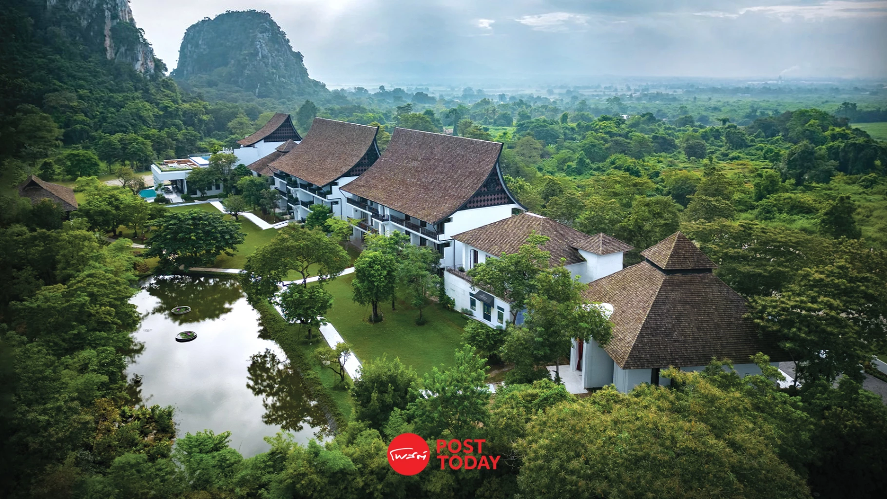 หลังคาแบบไทยประยุกต์ที่ด้านไม่เท่ากันสร้างแนวลาดอันมีมิติ ขณะที่ภายในประดับด้วยรายละเอียดที่บ่งบอกถึงความใส่ใจในทุกองค์ประกอบ ทั้งหมดนี้กลมกลืนไปกับภูมิทัศน์สีเขียวโดยรอบที่ทำให้รู้สึกว่าตัวอาคารเป็นส่วนหนึ่งของธรรมชาติ ไม่ใช่สิ่งแปลกปลอมที่มาแทรกกลางหุบเขา