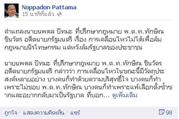 นายนพดล ปัทมะ ที่ปรึกษากฎหมาย พ.ต.ท.ทักษิณ ชินวัตร อดีตนายกรัฐมนตรี แถลงผ่านเฟซบุ๊กส่วนตัว Noppadon Pattama เรื่อง การเคลื่อนไหวไม่ได้เพื่อล้มกฎหมายนิรโทษกรรม แต่หวังล้มรัฐบาลของประชาชน