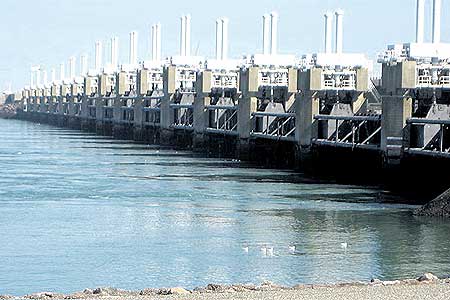 ส่วนที่เป็นประตูระบายน้ำนั้น ไม่ได้ทำการปิดกั้นน้ำทะเลจากการไหลสู่แม่น้ำด้านในอย่างถาวร แต่จะปิดประตูเฉพาะเวลาที่มีคลื่นลมแรง ซึ่งเสี่ยงต่อภาวะน้ำทะลักเข้าสู่บริเวณที่อยู่อาศัย