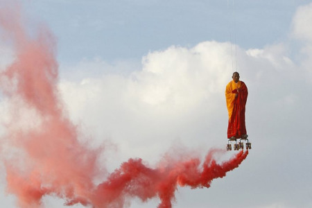 ช่างภาพชาวจีนแต่งตัวเป็นพระภิกษุสงฆ์ และแขวนตัวเองบนในอากาศโดยใช้สายสลิง ทำทีเหมือนลอยได้ ขณะเดียวกันยังมีควันสีแดงพุ่งออกมาจากรองเท้า ดูแล้วเหมือนกำลังลอยอยู่บนอากาศ