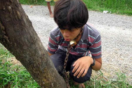 ตำรวจกัมพูชา ออกหมายจับพ่อโหดทำโทษลูกชายติดเกมฯ ด้วยการล่ามโซ่กับเสากลางหมู่บ้าน