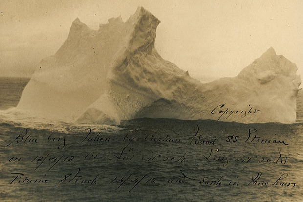 เดอะซัน - นี่คือภาพภูเขาน้ำแข็งที่เชื่อว่าเป็นตัวการจมเรือไททานิค โดยด้านหน้าของภาพเขียนข้อความ โดยกัปตันเรือ S.S. Etonian ซึ่งเป็นผู้ถ่ายภาพภูเขาน้ำแข็งลูกนี้ไว้เมื่อวันที่ 12 เมษายน ปี 1912 หรือก่อนที่เรือจะประสบอุบัติเหตุล่มลงกลางมหาสมุทรแอตแลนติกเพียง 2 วัน ในวันที่14 เมษายน ปี 1912 ก่อนจมลงสู่ก้นมหาสมุทรพร้อมกับผู้โดยสารและลูกเรืออีก 1,502 ชีวิต
