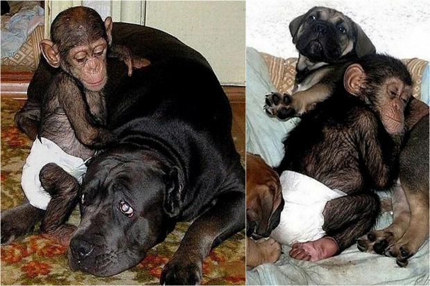 เจ้าซิมแปนซีกำลังกินอาหารมื้อเย็นอย่างมีความสุขกับลูกๆสุนัขตัวน้อย มันถูกทิ้งในสวนสัตว์ โดยแม่ของมันเอง ผู้ดูแลสวนสัตว์จึงนำมามันมาอยู่และกับสุนัขที่บ้านของเขา และเมื่อสุนัขคลอดลูก เจ้าแม่สุนัขก็รวมเจ้าชิมแปนซีเป็นเข้าลูกไปด้วย
