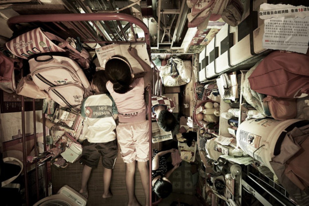 องค์กรสังคมเพื่อชุมชน (society for community organization) ในฮ่องกง ได้เผยภาพถ่ายมุมสูงที่แสดงถึงสภาพความเป็นอยู่ของชาวฮ่องกงที่ยากจน ที่ 1 คน หรือ 1 ครอบครัว ต้องอาศัยอยู่ร่วมกันภายในอพาร์ตเมนต์ห้องเล็กๆ ที่รวมสิ่งอำนวยความสะดวกในชีวิตทุกอย่างมาไว้ในห้องเดียวกัน ทั้งห้องนอน ห้องครัว ห้องอาหาร ห้องนั่งเล่น ที่ซักล้าง