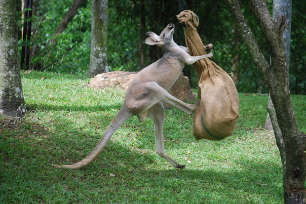 จิงโจ้แดง สวนสัตว์เปิดเขาเขียว มีพฤติกรรมเตะกระสอบทรายคล้ายนักมวย โดยใช้ขากระโดดถีบ สร้างความประทับใจให้แก่นักท่องเที่ยว