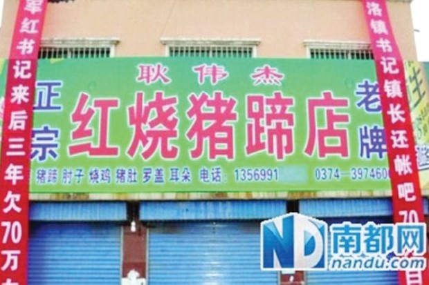 หนึ่งในนั้นคือ เกิงเว่ยเจีย เจ้าของร้านขาหมูตุ๋นในเมืองหวางหลัว มณฑลเหอหนาน ที่ทำมาค้าไม่ขึ้นซะที เพราะเจ้าหน้าที่ของรัฐบาลมักยกขบวนมากินขาหมู แล้วเซ็นค่าอาหารทุกครั้งไม่เคยจ่ายสักแดง รวมบิลแล้วเป็นเงินถึง 700,000 หยวน หรือ 3,500,000 บาท!