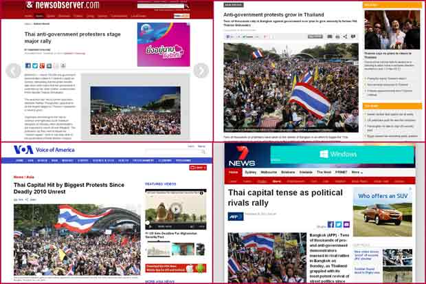 ปิดท้ายที่ สำนักข่าวเอเอฟพี รายงานว่า ประชาชนราว 1 แสนคน ทั้งฝ่ายขับไล่รัฐบาล และสนับสนุน รัฐบาล (เสื้อแดง) ได้จัดการชุมนุมทางการเมือง ในกรุงเทพ เมื่อวันอาทิตย์ที่ 24 พ.ย.ที่ผ่านมา ถือเป็นการต่อสู้ทางการเมืองบนท้อถนน ที่สำคัญมากที่สุดนับตั้งแต่ เกิดเหตุนองเลือดในปี 2010 เป็นต้นมา