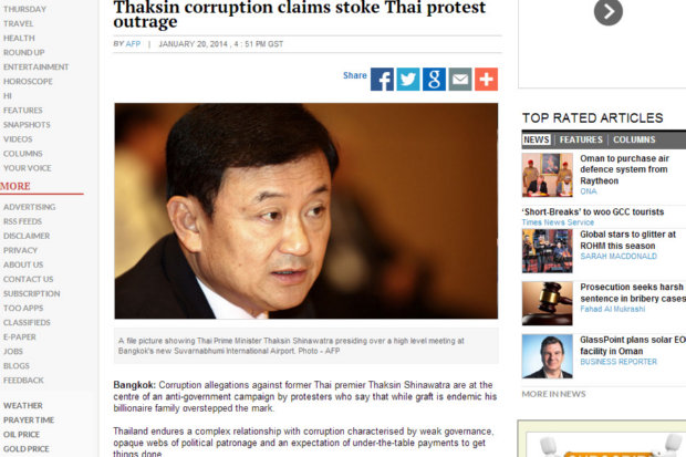สำนักข่าวเอเอฟพีรายงานว่า ข้อกล่าวหาว่า พ.ต.ท.ทักษิณ ชินวัตร อดีตนายกรัฐมนตรี ทุจริตคอร์รัปชั่นนั้น นับเป็นหัวใจสำคัญของการชุมนุมประท้วงขับไล่รัฐบาลที่กำลังเกิดขึ้น ซึ่งผู้ชุมนุมต่างระบุว่า แม้การคอร์รัปชั่นจะเป็นเรื่องที่พบเห็นได้ทั่วไปในการเมืองไทย ทว่าตระกูลชินวัตรกลับล้ำเล้นของการโกงไปไกลกว่ามาก