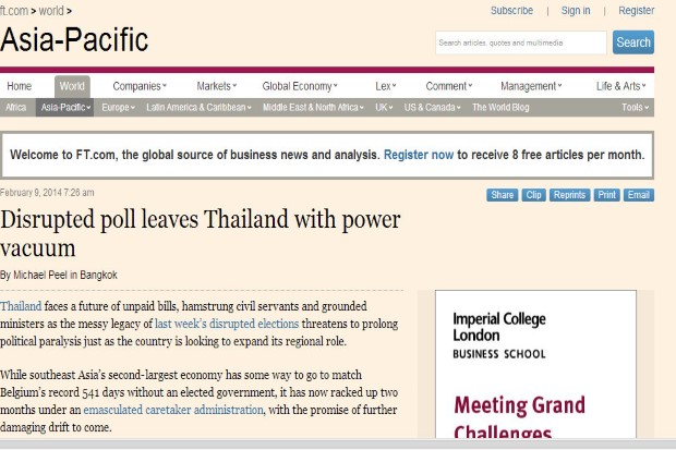 หนังสือพิมพ์ ไฟแนนเชียลไทมส์ รายงานว่า ไทยกำลังเผชิญ กับ "ภาวะสุญญากาศทางอำนาจ" เนื่องจากไทยกำลังเผชิญปัญหามากมาย ทั้ง ปัญหาข้าราชการและหน่วยงานราชการงานหลายหน่วยถูกปิดทำการ และความชอบธรรมด้านการเลือกตั้งที่กำลังเสื่อมถอยลงเรื่อยๆ ทำให้วิกฤตการเมืองไทยส่อแววว่าจะยืดเยื้อ ท่ามกลางภาวะที่ไทยกำลังต้องการที่จะขยายบทบาทนำในภูมิภาค แต่ไม่สามารถทำได้ เพราะไม่สามารถจัดตั้งรัฐบาลที่มีอำนาจเต็มขึ้นบริหารประเทศได้