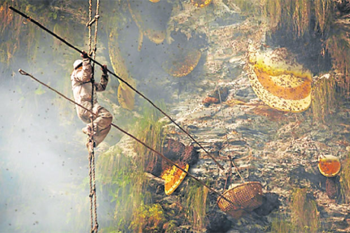 แอนดรูว์ นิวเวย์ นำภาพถ่ายรังผึ้งที่ใหญ่ที่สุดในโลก ซึ่งค้นพบระหว่างเดินทางตะลอนแถบเทือกเขาหิมาลัยออกเผยแพร่ โดยรังผึ้งแห่งนี้เป็นส่วนหนึ่งของภาพถ่ายชุดวัฒนธรรมเก็บน้ำผึ้งของชาวกูรัง ที่จะเก็บน้ำผึ้งกันปีละ 2 ครั้ง ด้วยวิธีสุมควันไฟไล่ผึ้งออกจากรังก่อนจะเก็บน้ำผึ้งออกมา โดยขั้นตอนที่ยากที่สุดของการเก็บน้ำผึ้งคือการขึ้นไปตัดรังผึ้งลงมา ซึ่งต้องใช้ความกล้าหาญอย่างมากในการไต่เชือกขึ้นไปยอดต้นไม้