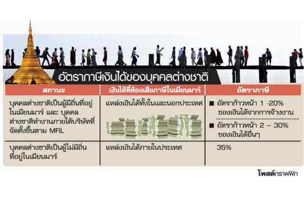 2.ในกรณีที่ชาวต่างชาติเป็นผู้ไม่มีถิ่นที่อยู่ในพม่า (Non-Resident Foreigner) คือบุคคลที่พำนักอยู่ในพม่าไม่ถึง 183 วันนั่นเอง โดยจะเสียภาษีในอัตรา 35% ของเงินได้ที่ได้รับมาจากการทำงานในพม่าเท่านั้น ยกเว้นในกรณีที่บุคคลดังกล่าวทำงานให้แก่บริษัท ที่จัดตั้งขึ้นตามกฎหมายว่าด้วยการลงทุนของชาวต่าวชาติ (MFIL : Myanmar Foreign Investment Law, 2012) และบริษัทดังกล่าวได้รับสิทธิประโยชน์การลงทุนให้พนักงานต่างชาติเสียภาษีในอัตราก้าวหน้าที่อัตรา 1-20% ของเงินได้