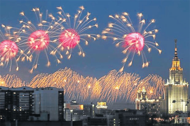 ดอกไม้ไฟที่สว่างไสวเหนือฟากฟ้ากรุงมอสโก ในคืนวันที่ 9 พ.ค.ที่ผ่านมา ในงานเฉลิมฉลองครบรอบปีที่ 69 ที่สหภาพโซเวียตและชาติพันธมิตรมีชัยชนะเหนือการรุกรานของนาซีเยอรมนีในปี 1945 เมื่อครั้งสงครามโลกครั้งที่ 2 เพื่อเป็นเกียรติและรำลึกถึงทหารหาญผู้สละเลือดเนื้อปกป้องประเทศ