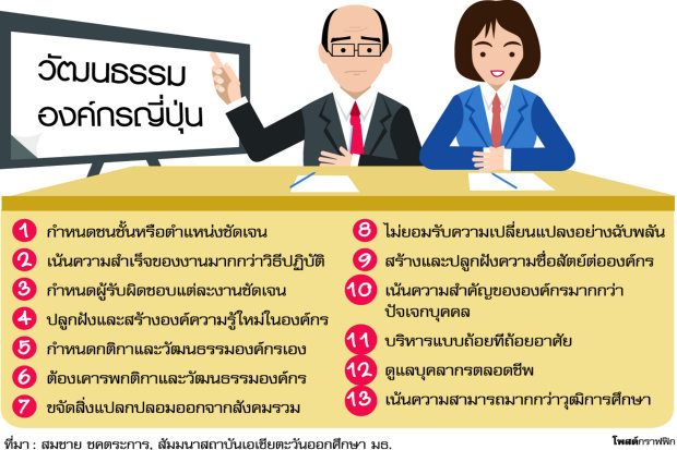 สำหรับเรื่องวัฒนธรรมองค์กรญี่ปุ่นนั้น สมชาย สรุปไว้ 13 ข้อหลักๆ ได้แก่ 1.กำหนดชนชั้นหรือตำแหน่งชัดเจน 2.เน้นความสำเร็จของงานมากกว่าวิธีปฏิบัติ 3.กำหนดผู้รับผิดชอบอย่างชัดเจน 4.ปลูกฝังและสร้างองค์ความรู้ใหม่ในองค์กร 5.กำหนดกติกาและวัฒนธรรมองค์กรเอง
