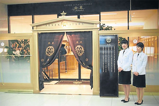 ระหว่างนั่งทานของหวานก็มีคนมาบรรเลงเพลงจากเปียโนให้ฟัง แต่พวกเราไม่มีใครนั่งอยู่เป็นสุข เพราะมัวแต่ถ่ายรูปมุมนั้นมุมนี้ ส่วนผมก็เดินสำรวจไปทั่ว ต้องบอกเลยว่ารายละเอียดของเฟอร์นิเจอร์และของตกแต่งนั้นไม่ธรรมดา ทุกชิ้นผ่านการควบคุมจากคุณเออิจิ มิโตะโอกะ แทบทั้งสิ้น อย่างเฟอร์นิเจอร์ที่วางอยู่บนโต๊ะกลางก็เป็นงานชุดเดียวกันกับอ่างล้างมือในห้องน้ำบนรถไฟเจ็ดดาว ไม้ที่ใช้ทำเฟอร์นิเจอร์ก็มีลักษณะเดียวกับไม้ที่ใช้บนรถไฟ ลายของเบาะหุ้มเฟอร์นิเจอร์ก็ลายเดียวกันกับบนรถไฟ คือทุกอย่างในเลานจ์นี้ล้วนแล้วแต่สัมพันธ์กับบนรถไฟแทบทั้งสิ้น เหมือนเป็นหนังตัวอย่างก่อนจะได้ชมภาพยนตร์จริงประมาณนั้น ด้านหนึ่งของห้องมีตู้โชว์ของที่ระลึก มีทั้งถ้วยชา ปากกา เข็มกลัด สารพัดอย่าง ถ้าใครได้รับของที่ระลึกที่มีสัญลักษณ์ของ Seven Stars เหล่านี้ขอให้ภูมิใจ เพราะบรรดาของในตู้นี้ไม่ขายให้กับคนทั่วไปครับ เฉพาะผู้โดยสารของ Seven Stars เท่านั้นจึงมีสิทธิซื้อ ผมไม่แน่ใจว่าจะสั่งซื้อในเลานจ์ได้เลยหรือเปล่า เพราะลืมถามไป แต่ผมซื้อจากบนรถไฟมาหลายชิ้นอยู่ ตอนแรกก็ตั้งใจว่าจะซื้อฝากคนโน้นคนนี้ แต่พอเอาเข้าจริงๆ เก็บไว้เองหมดเพราะเสียดาย และไม่รู้ว่าคนที่ได้รับไปเขาจะประทับใจเหมือนกับเราหรือไม่ ที่ผมซื้อบนรถไฟก็เพราะใช้บริการเขาแล้วมีความสุขเลยอยากหาของที่ระลึกไว้เตือนความทรงจำ ไม่รู้ว่าจะอีกกี่ปีถึงจะได้มาขึ้นอีกรอบ