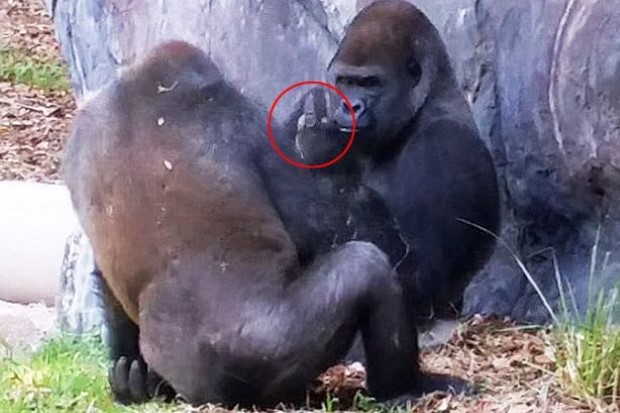 อาจะเป็นเรื่องธรรมดาๆ หากเราจะเห็นคนกระทบกระทั่งแล้วชูนิ้วกลางใส่กัน แต่ไม่เชื่อก็ต้องเชื่อว่าบางครั้งเมื่อกอลิล่าเกิดอาการไม่พอใจก็มักชูนิ้วกลางขึ้นมาด้วยเช่นกัน ดังที่จะเห็นในคลิปวีดีโอ "Silverback gorilla gives middle finger to annoying friend" เมื่อเจ้ากอลิล่าตัวหนึ่งในสวนสัตว์เมืองแทมปา สหรัฐ ไปกวนเพื่อนอีกตัวให้ยอมมาเล่นด้วยด้วยวิธีปาของใส่ จนเพื่อนมันสุดทนชูนิ้วกลางใส่หน้าตาเฉย ทำเอาหลายๆ คนถึงกับยิ้มหัวเราะให้กับความแสนรู้ของพวกมัน