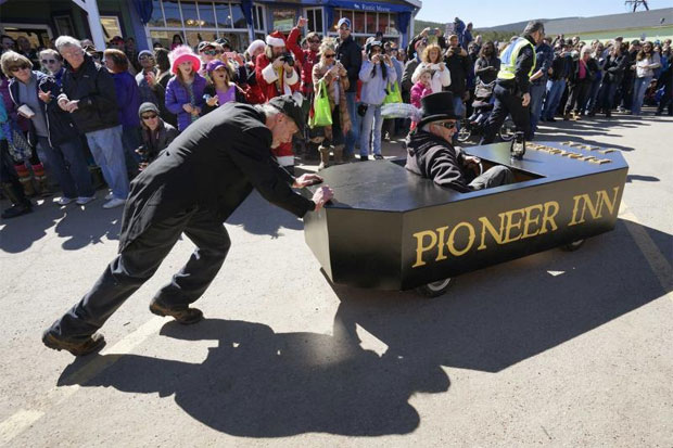 ผู้คนกำลังเข็นโลงศพไปตามท้องถนนในขบวนพาเหรดวัน “Frozen Dead Guy”