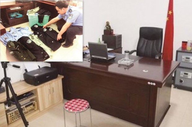 จากการตรวจค้นบ้านทำให้เจ้าหน้าที่ต้องผงะ เมื่อเจอเข้ากับสถานีตำรวจปลอมที่ผ่านการจัดแต่งอย่างพิถีพิถัน มีเครื่องใช้ไม้สอยไม่ต่างจากสถานที่จริงของราชการ ไม่ว่าจะเป็นรูปปั้นครึ่งตัวของ เหมาเจ๋อตุง อดีตผู้นำของประเทศ ธงชาติ เอกสารปลอม เครื่องจีพีเอส และกล้องวงจรปิดขนาดเล็ก นอกจากนั้น ในตู้เสื้อผ้าของสารวัตรตัวปลอมยังพบเสื้อคลุมตำรวจปราบปรามอาชญากรรม เจ้าหน้าที่จึงเก็บรวบรวมหลักฐานต่างๆ เตรียมดำเนินคดีกับผู้ต้องหารายนี้