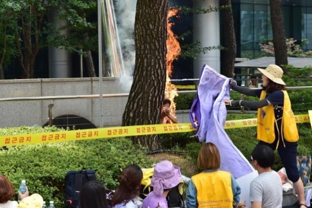 ชายเกาหลีใต้จุดไฟเผาตัวเองขณะเดินขบวนเรียกร้องให้ญี่ปุ่นออกมาขอโทษกรณีจับหญิงเกาหลีไปเป็นเหยื่ออารมณ์เมื่อสงครามโลกครั้งที่2