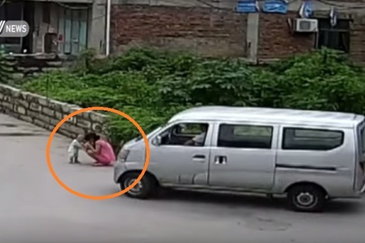 คลิปอุทาหรณ์!แม่ลูกจีนยืนเล่นตรงหัวโค้ง รถตู้ไม่เห็น-เลี้ยวทับเด็ก
