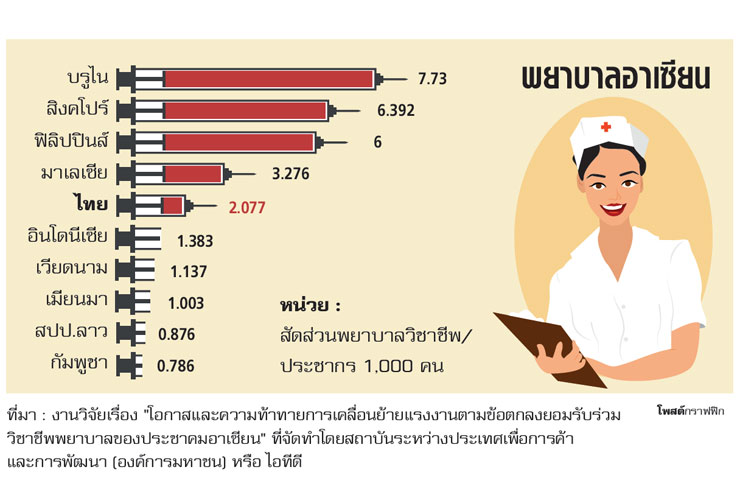 ด้าน ยุพิน อังสุโรจน์ อาจารย์คณะพยาบาลศาสตร์ จุฬาลงกรณ์มหาวิทยาลัย กล่าวว่า พยาบาลวิชาชีพมีปัญหาขาดแคลนมาตลอด โดยสถานการณ์ตลาดพยาบาลวิชาชีพพยาบาลในอาเซียน พบว่า ไทยมีสัดส่วนพยาบาล 2.07 คน/ประชากร 1,000 คน ซึ่งใกล้เคียงกับเกณฑ์ขั้นต่ำที่องค์การอนามัยโลก (WHO) ที่กำหนดไว้ที่ 2 คน/ประชากร 1,000 คน