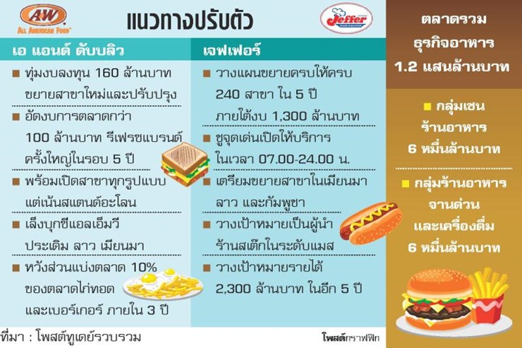 เป็นปีที่ธุรกิจร้านอาหารมีความคึกคักอีกหนึ่งปี เพราะหลังจากมีการซื้อขายกิจการในธุรกิจร้านอาหารหลายแบรนด์ใน 1-2 ปีที่ผ่านมา ส่งผลให้ปีนี้ผู้ประกอบการใหม่เริ่มออกมาประกาศแผนธุรกิจว่าจะเดินไปในทิศทางไหนต่อจากนี้ ล่าสุดร้านเจฟเฟอร์กับเอ แอนด์ ดับบลิว ก็ออกมาประกาศแผนเชิงรุก เพื่อผลักดันให้แบรนด์เป็นที่รู้จักและมียอดขายเป็นไปตามเป้าหมายที่วางไว้