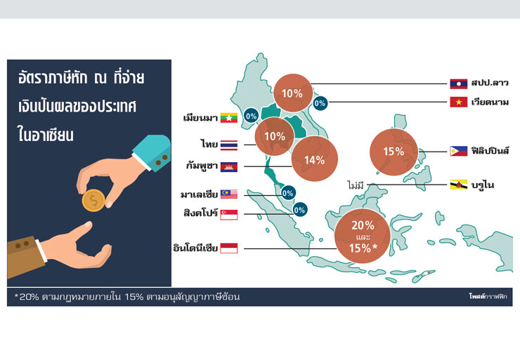 บางประเทศกำหนดให้บริษัทผู้จ่ายเงินปันผลต้องหักภาษี ณ ที่จ่าย โดยปัจจุบันชาติสมาชิกอาเซียนที่กำหนดให้หักภาษีเงินได้ ณ ที่จ่าย เมื่อจ่ายเงินปันผลนอกจากไทยก็มี สปป.ลาว ฟิลิปปินส์ กัมพูชา อินโดนีเซีย โดยไทยมีอัตราต่ำสุดที่ร้อยละ 10 และอินโดนีเซียสูงสุดร้อยละ 20 ภายใต้อนุสัญญาการเว้นการเก็บภาษีซ้อนที่อินโดนีเซียทำกับไทย อัตราภาษีของอินโดนีเซียจะลดเหลือร้อยละ 15 ประเทศที่เหลือ 5 ประเทศสมาชิกไม่มีการหักภาษีกรณีจ่ายเงินปันผล