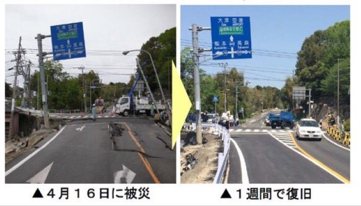 ภาพถนนถนนที่ได้รับความเสียหายจากแผ่นดินไหวคุมาโมโตะ ถูกทางการซ่อมเเซมเเล้วเสร็จภายใน 1 สัปดาห์
