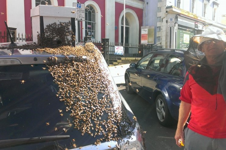 เพราะจู่ๆ มีฝูงผึ้งนับหมื่นๆ ตัวมารุมเกาะที่รถ ทำเอาผู้คนที่ผ่านไปผ่านมาต้องหยุดถ่ายรูปกันเป็นแถว ส่วนเจ้าของรถก็ไม่รู้ว่าเกิดอะไรขึ้น ต้องเรียกคนเลี้ยงผึ้งมาช่วยจัดการให้ที ก่อนที่จะทำร้ายคนแถวๆ นั้นซะก่อน