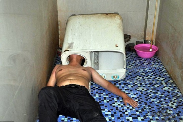 หนุ่มจีนพยายามมุดซ่อมเครื่องซักผ้า สุดท้ายหัวติด-เอาไม่ออก