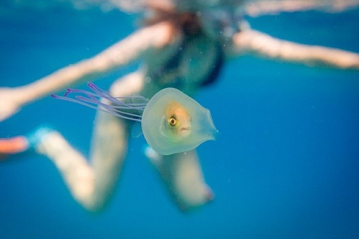 เผยภาพหาชมยากของสัตว์โลก ปลาน้อยติดอยู่ในร่างแมงกะพรุนทั้งเป็น