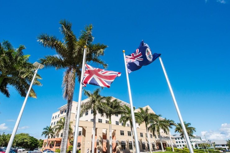 ธงชาติและธงสหราชอาณาจักรหน้าอาคารรัฐสภาของหมู่เกาะเคย์แมน ในแคริบเบียนร่วมถวายความอาลัยแก่การสวรรคตของสมเด็จพระเจ้าอยู่หัวภูมิพลอดุลยเดช ด้วยการลดธงครึ่งเสา