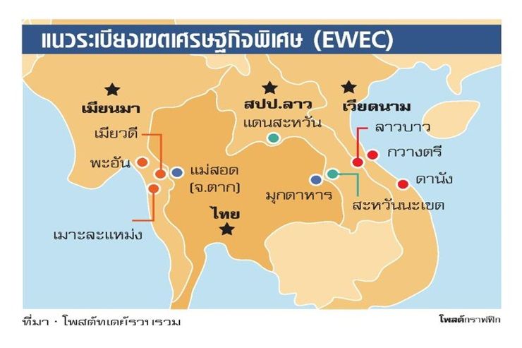 ทั้งนี้ โครงการ EWEC จะเป็นเส้นทางการค้าที่สำคัญอีกแห่งของโลก เพราะเชื่อม 4 ประเทศสมาชิกในกลุ่มภูมิภาคลุ่มน้ำโขง (จีเอ็มเอส) ประกอบด้วย เมียนมา ไทย สปป.ลาวและเวียดนาม อีกทั้งเส้นทางสายนี้เป็นเส้นทางคมนาคมทางบกเพียงเส้นเดียวที่เชื่อมโยงคาบสมุทรอินเดียและคาบสมุทรแปซิฟิกเข้าด้วยกัน โดยเริ่มจากจังหวัดดานังของเวียดนาม ผ่านไปยังแขวงสะหวันนะเขตของ สปป.ลาว ผ่านสะพานมิตรภาพไทย-สปป.ลาว แห่งที่ 2 ข้ามมายัง จ.มุกดาหาร ผ่าน จ.ขอนแก่น และ จ.ตาก ไปสิ้นสุดถึงที่เมืองเมาะละแหม่ง ในรัฐกะเหรี่ยงของเมียนมา อยู่ฝั่งมหาสมุทรอินเดีย