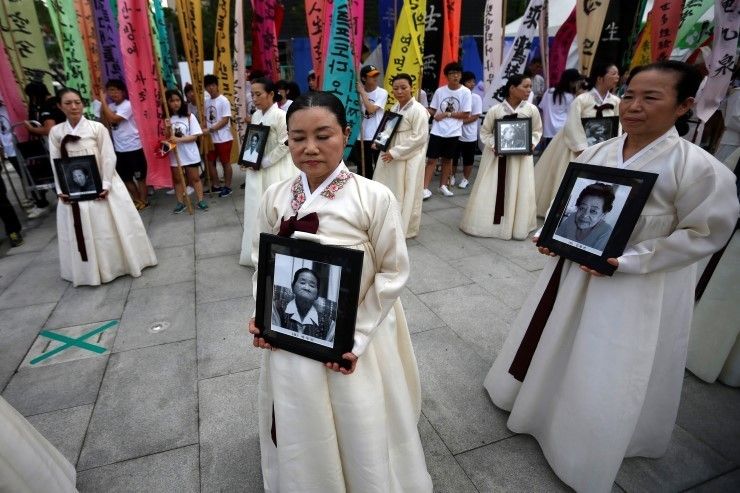 โดยที่ผ่านมารัฐบาลญี่ปุ่นได้ปฏิเสธว่ายังไม่มีหลักฐานที่แน่ชัดที่สามารถพิสูจน์ได้ว่ามีสตรีถูกบังคับให้ทำงานในซ่องของญี่ปุ่น ทั้งนี้ในปี 2015 รัฐบาลนางปาร์ก กึน เฮ ได้มีมติตกลงร่วมกันกับญี่ปุ่นที่รัฐบาลญี่ปุ่นจะมอบเงินช่วยเหลือจำนวน 8.6 พันล้านดอลลาร์ให้แก่ผู้รอดชีวิตชาวเกาหลี