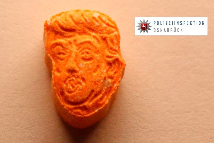 สำนักข่าวเอ็นดีอาร์รายงานว่า - ตำรวจเยอรมนีในเมืองออสนาบรุก ในแคว้นโลเวอร์-แซกโซนี่ ทางภาคตะวันตกเฉียงใต้ ตรวจยึดยาอีพิมพ์ใบหน้าเป็นรูปประธานาธิบดีโดนัลด์ ทรัมป์ สีส้ม หลายพันเม็ดมีราคาประเมินที่ขายในตลาดราว 39,000 ยูโร หรือราว 1,500,000 บาท พร้อมมีเงินสดอีกปึกใหญ่