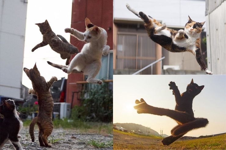 จากคอลเลคชั่นภาพถ่ายของฮิซากาตะจะเห็นท่าทางการเคลื่อนไหวสุดพริ้วของเหล่าแมวเหมียว คล้ายกำลังฝึกคาราเต้อย่างไรอย่างนั้น ทั้งท่วงท่าและลีลา ไม่ว่าจะกระโดดเตะอย่างมืออาชีพ หรือปล่อยหมัดทรงพลัง เจ้าเหมียวก็ทำได้ดี แถมท่ายังสวยประหนึ่งเป็นแชมป์คาราเต้สี่สมัย