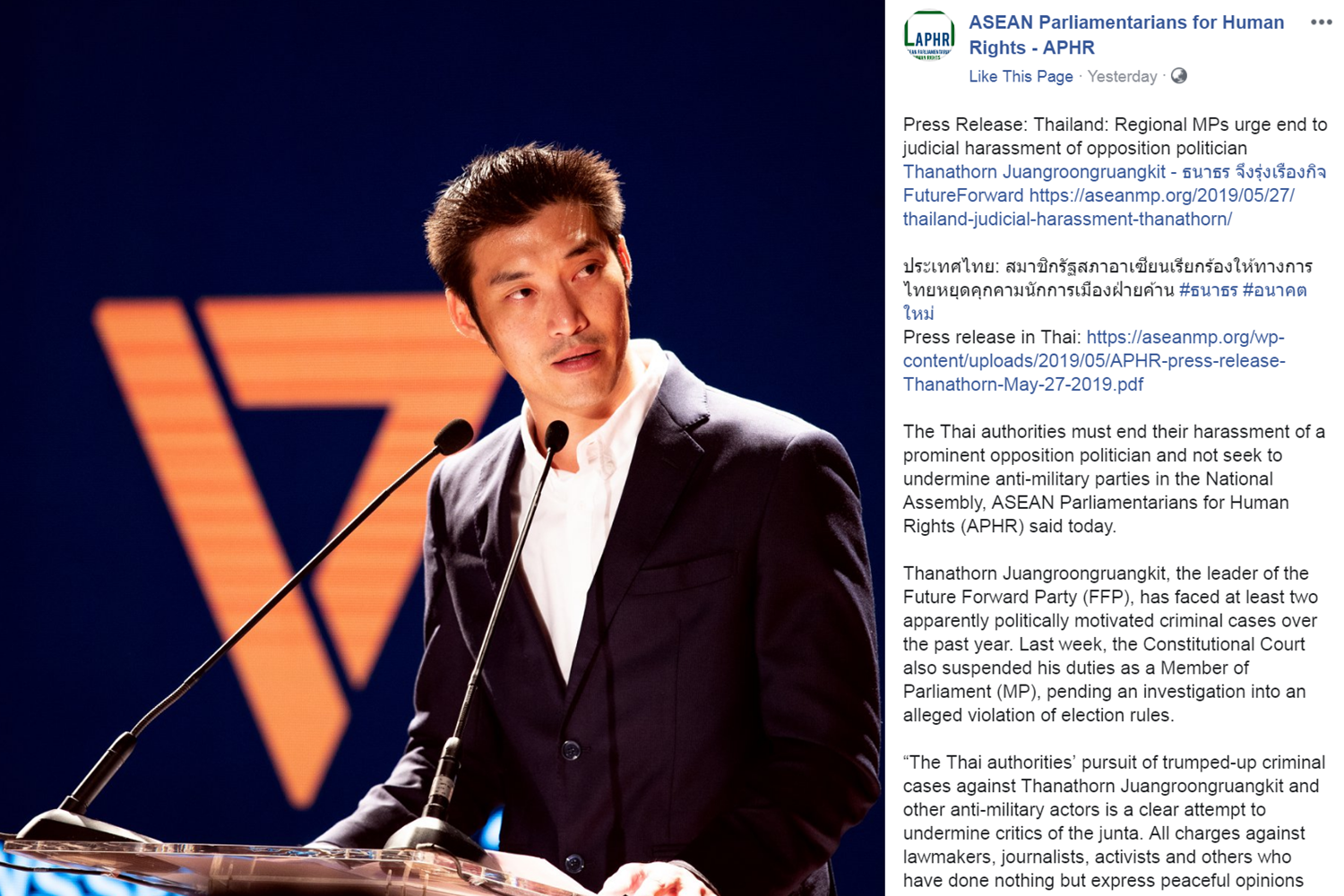ในแถลงการณ์ APHR ได้เรียกร้องและหยุดทําลายพรรคการเมืองที่ต่อต้านทหาร และชี้ว่านายธนาธร จึงรุ่งเรืองกิจ หัวหน้าพรรคอนาคตใหม่ กําลังเผชิญกับคดีอาญาที่มีแรงจูงใจทางการเมืองอย่างน้อยสองคดีในปีที่ผ่านมา อย่างไรก็ตาม การที่ APHR ให้ความสนใจกับนายธนาธรเป็นพิเศษ ทำให้ฝ่ายการเมืองที่ไม่สนับสนุนนายธนาธรเกิดความกังขาต่อกลุ่มนี้ และพยายามชี้ว่า APHR เป็นกลถุ่มที่ไม่มีเครดิตทางการเมือง