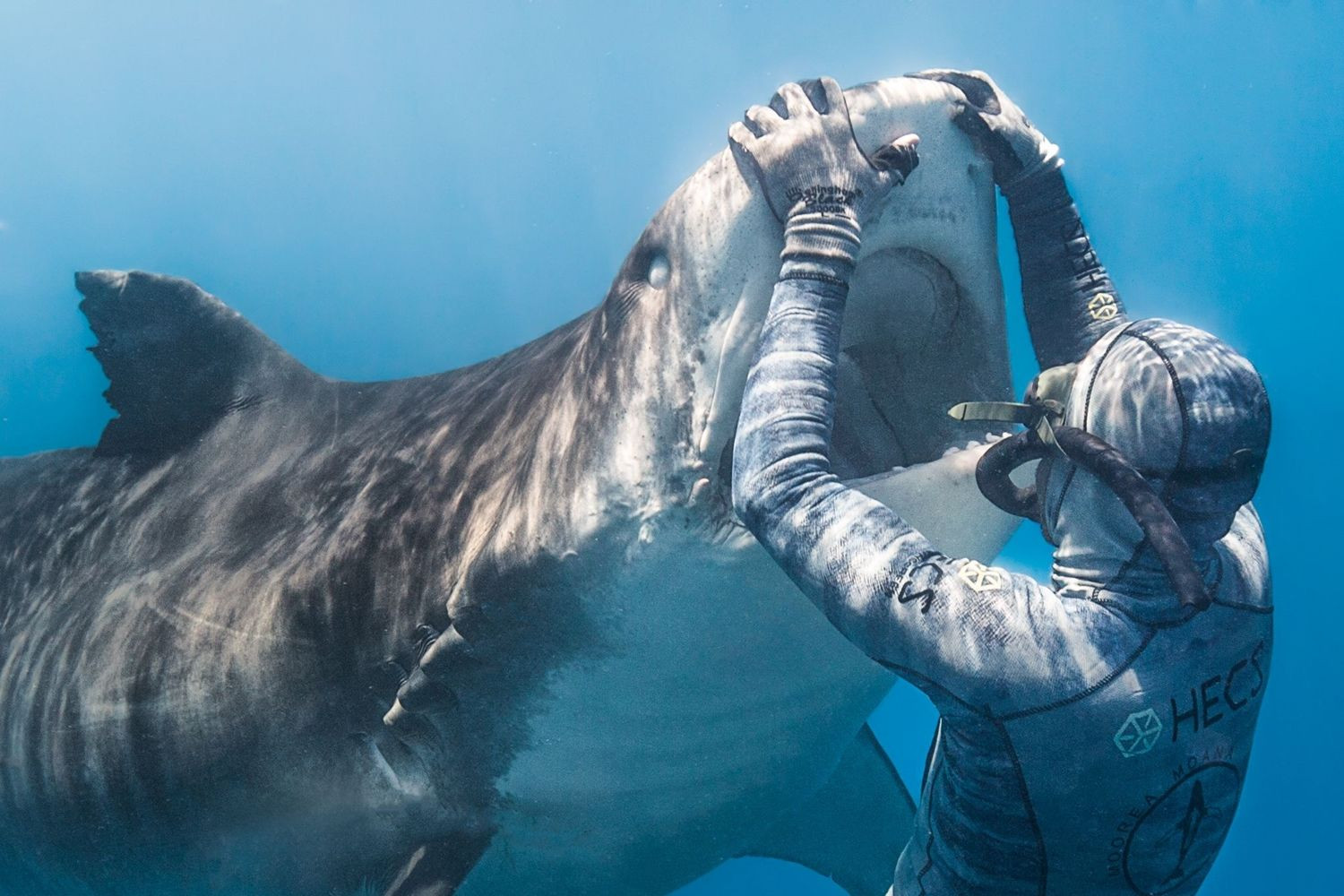 ปิแยร์ริค เซย์บาลด์ (Pierrick Seybald) นักประดาน้ำอิสระชาวฝรั่งเศส เผชิญหน้ากับฉลามในน่านน้ำทางตอนเหนือของเกาะตาฮิติ ในเขตเฟรนช์โปลินีเซีย กลางมหาสมุทรแปซิฟิก