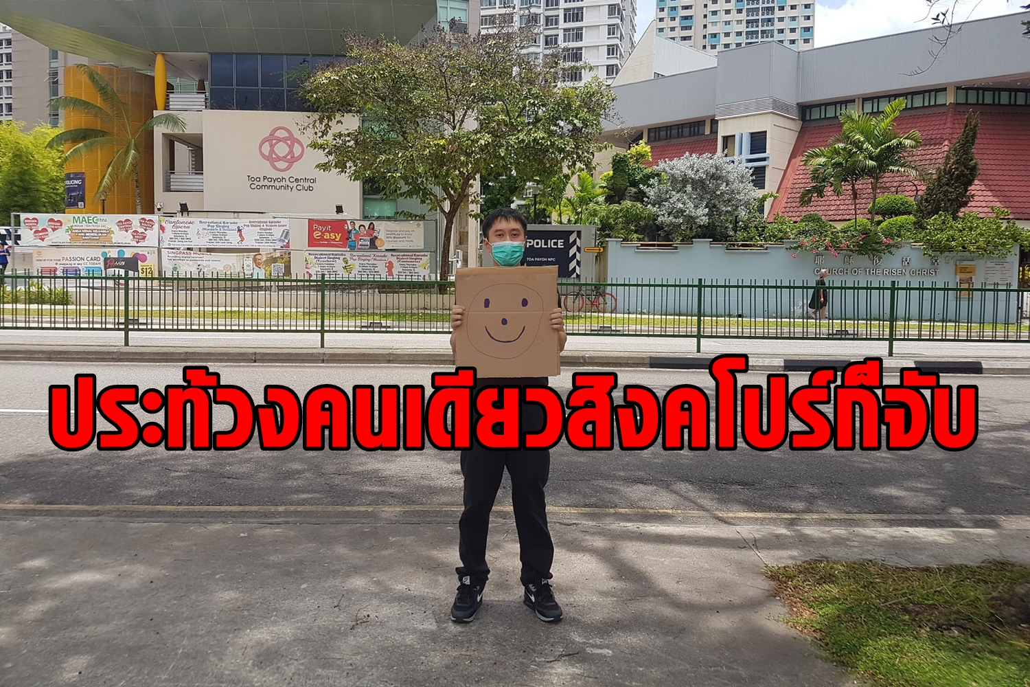 ประท้วงคนเดียวก็จับ สิงคโปร์ตั้งข้อหาหนุ่มถือป้ายยิ้มหน้าสน.