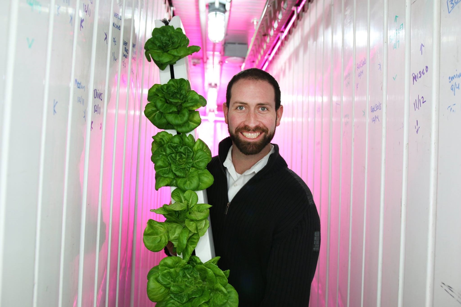 ภายในตู้ขนาดราว 320 ตร.ฟุต ติดตั้งหลอดไฟแอลอีดี แท่นปลูกผักแนวตั้ง อุปกรณ์ควบคุมอุณหภูมิและระบบน้ำ โดยใช้การปลูกพืชแบบไฮโดรโปนิกส์