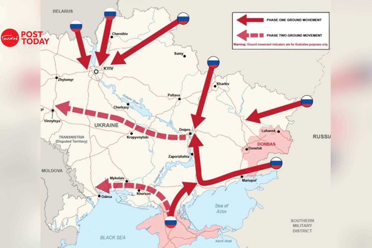 กระทรวงกลาโหมอังกฤษเผยแพร่ภาพแผนที่ 7 เส้นทางความเป็นไปได้ที่ประธานาธิบดี วลาดิมีร์ ปูติน จะใช้บุกกรุงเคียฟและเมืองนีโปรซึ่งเป็นเมืองอุตสาหกรรมของยูเครน โดยบุกจากทั้งรัสเซีย เบลารุสซึ่งรัสเซียกำลังซ้อมรบร่วมระหว่างทั้งสองกองทัพ และจากแคว้นไครเมียที่รัสเซียยึดจากยูเครนเมื่อปี 2014