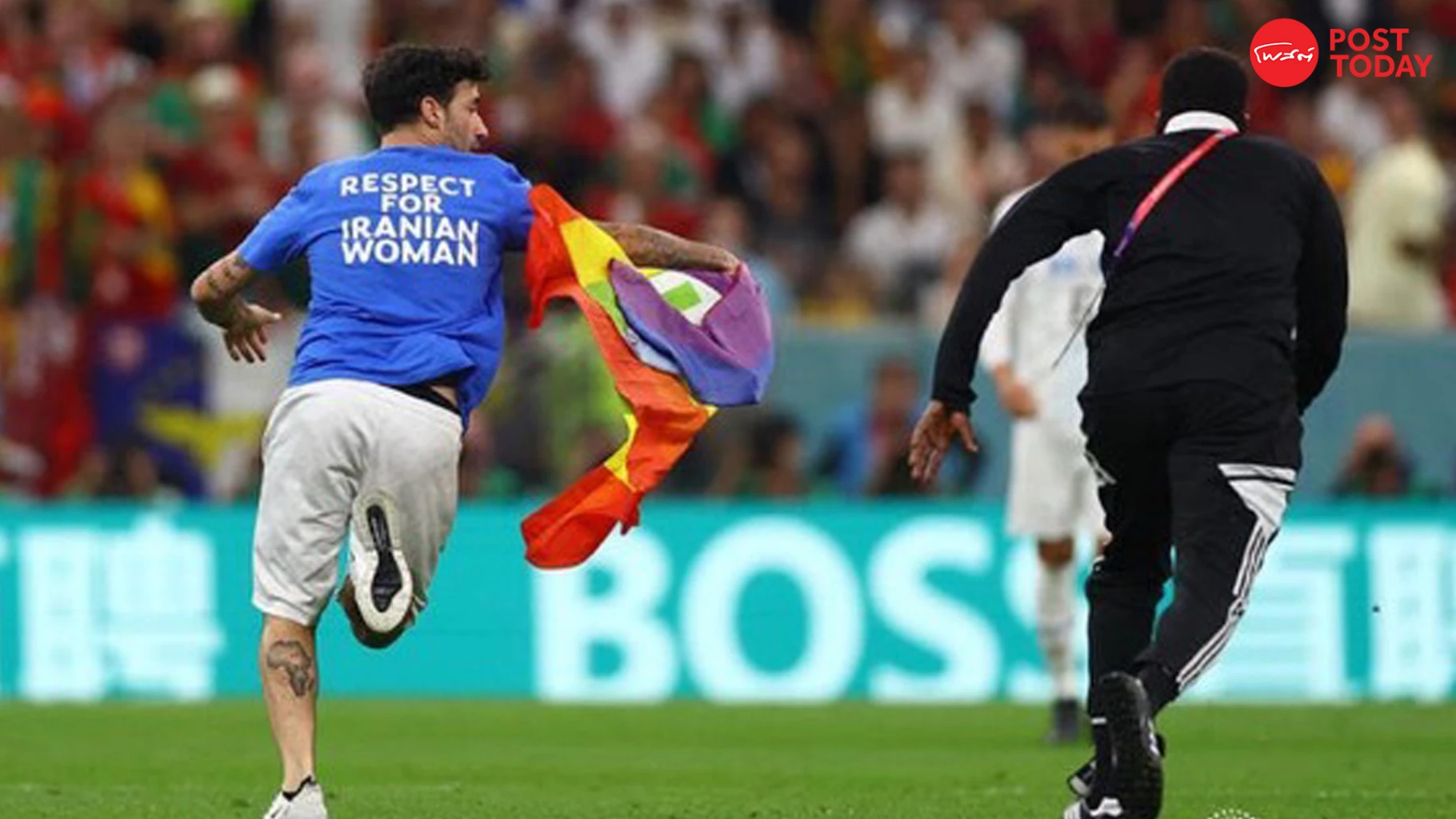 ความอลเวงเกิดขึ้นนาทีที่ 51 ของการแข่งขันฟุตบอลโลก 2022 ระหว่างโปรตุเกสกับอุรุกวัย ด้านฟีฟ่าแม้จะเลี่ยง เลือกไม่ถ่ายทอดภาพเหตุการณ์ดังกล่าว แต่อย่างไรก็ตามแฟนบอลรายนี้ดันวิ่งโบกธงสีรุ้งไปทั่วสนามให้ทุกคนได้ยลโฉม ก่อนที่ฝ่ายรักษาความปลอดภัยจะเข้ากุมตัวในภายหลัง ซึ่งสัญลักษณ์ธงสีรุ้งเป็นหนึ่งในสิ่งที่ถูกวิจารณ์และเปรียบเสมือนวัตถุต้องห้ามตลอดการแข่งขันฟุตบอลโลกในครั้งนี้