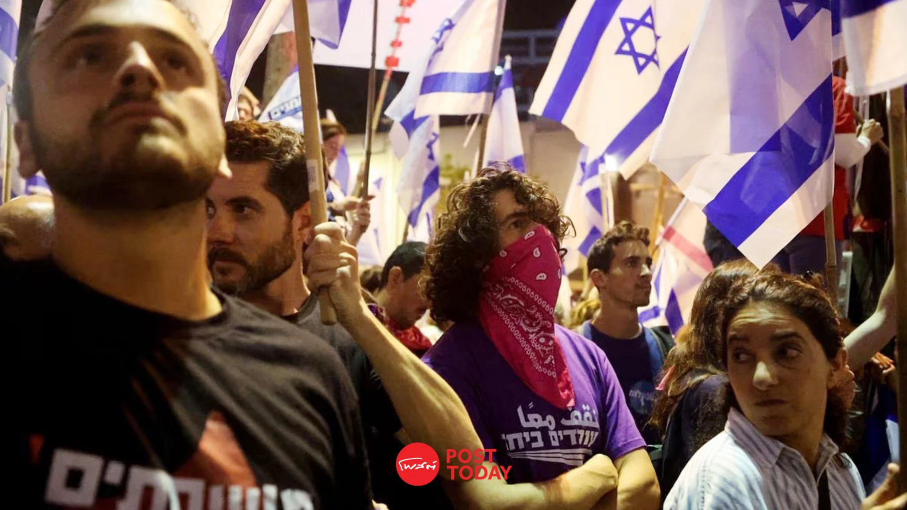 ในใจกลางกรุงเทลอาวีฟ ฝูงชนโบกธงสีน้ำเงินและสีขาวของอิสราเอล ซึ่งกลายเป็นจุดเด่นของการประท้วงในช่วง 3 เดือนที่ผ่านมารวมตัวกันเพื่อแสดงการต่อต้านแผนการที่พวกเขามองว่าเป็นภัยคุกคามต่อประชาธิปไตยของอิสราเอล