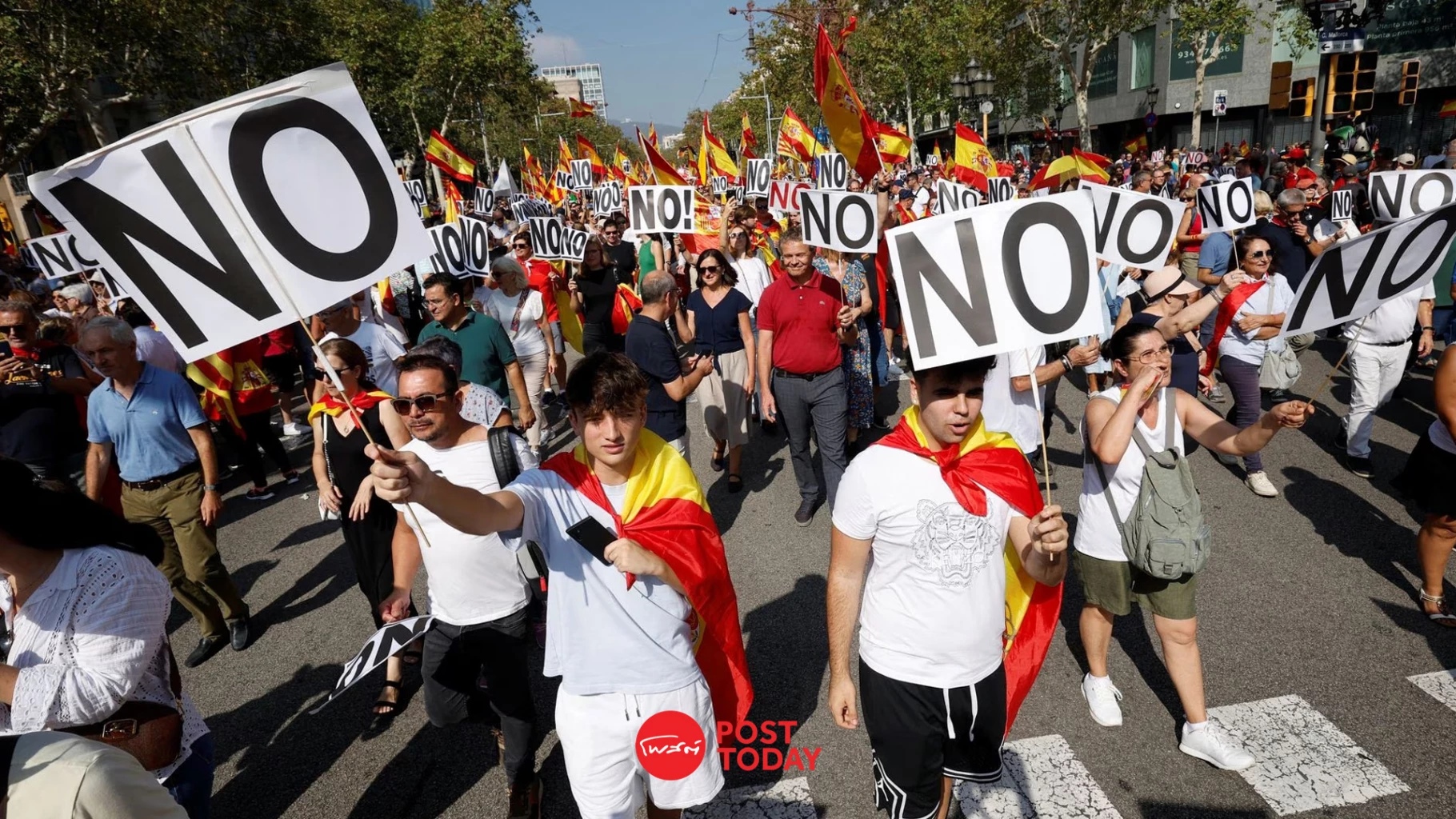 ชาวสเปนหลายหมื่นคนได้โบกธงชาติสเปนและธงของคาตาลุญญาระหว่างการเดินประท้วงเพื่อต่อต้านแผนของรักษาการนายกรัฐมนตรี Pedro Sanchez ที่จะนิรโทษกรรมให้กลุ่มแบ่งแยกดินแดนคาตาลุญญา โดยมีกลุ่ม Societat Civil Catalana เป็นผู้นำการประท้วงในครั้งนี้